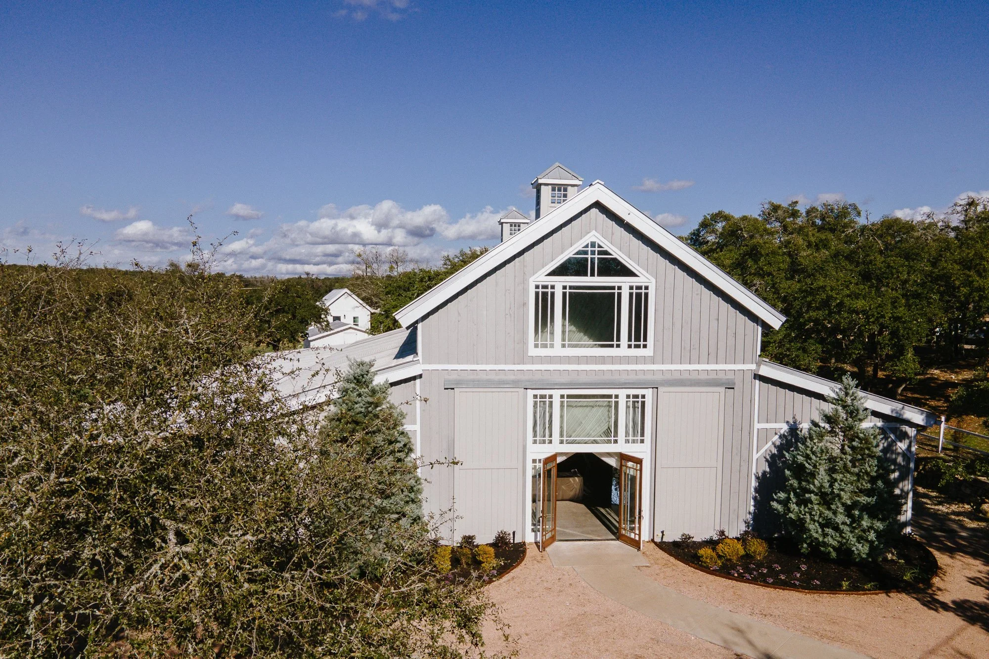Once a fully operational farm, we have kept many of the unique features of the farm, but with a modern desert twist. Palm trees, agave, and Mexican sage echo Baja California tucked away in the Lone Star State’s countryside. The property has been designed with a minimalist, and clean aesthetic to highlight its spaciousness.”